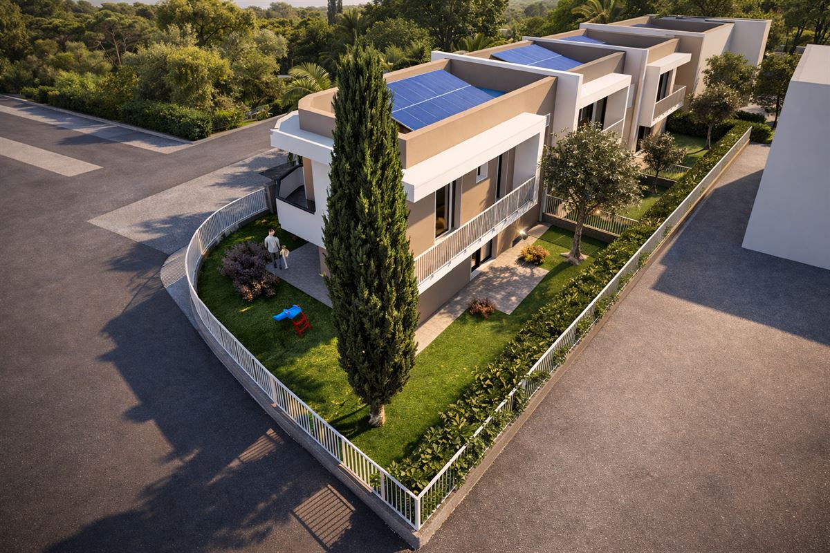 La proprietà include un garage singolo al piano terra e un posto auto esterno, garantendo praticità e sicurezza.Le dotazioni impiantistiche sono all’avanguardia: ogni abitazione è dotata di impianto fotovoltaico da almeno 3 kW, riscaldamento a pavimento alimentato da pompa di calore autonoma, e predisposizione per impianto di climatizzazione indipendente. La sicurezza e l’efficienza energetica sono ulteriormente garantite da porta d’ingresso blindata e serramenti in PVC con apertura vasistas, completi di zanzariere e tapparelle in alluminio motorizzate.